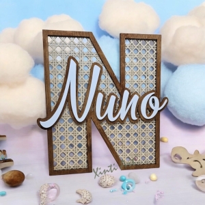 Em madeira com estilo de Rattan e nome em acrílico Tamanho +- 30*28cm